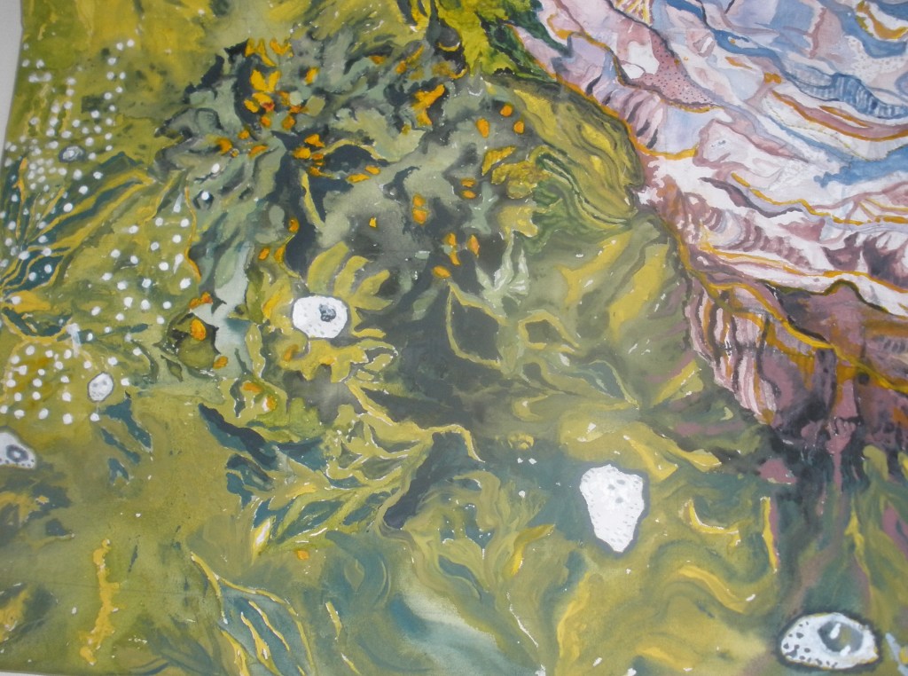 Förra veckans bild var en skiss till den triptyk som jag lägger ut i dag (se nedan). Den är målad med vanliga textilfärger på bomullsatin och består av tre separata bilder på 65 x 145 cm (i allt 195cm brett om delarna hänger tätt intill varandra).
