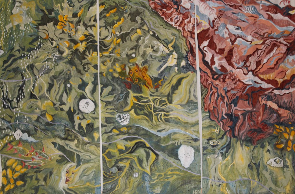 Det som är kul med att göra en liten skiss och en stor ”färdig bild” är att det går att gömma diverse figurer bland formationerna. I denna triptyk finns åtminstone 4 dansande par. Jag har lagt in dem eftersom jag upplever tångens rörelser som en slags dans. Där finns också flera ansikten, händer och andra figurer som våra hjärnor inte kan låta bli att läsa in i sjögräsets oförutsägbara mönster.