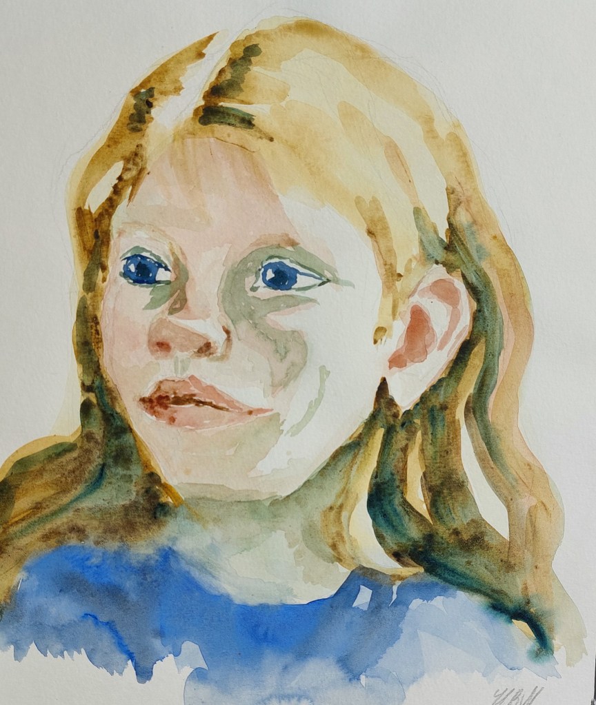 Helenas bilder skildrar ofta människors möte med vatten men den här gången har hon uteslutande tagit med porträtt i akvarellteknik. (Se bilden).